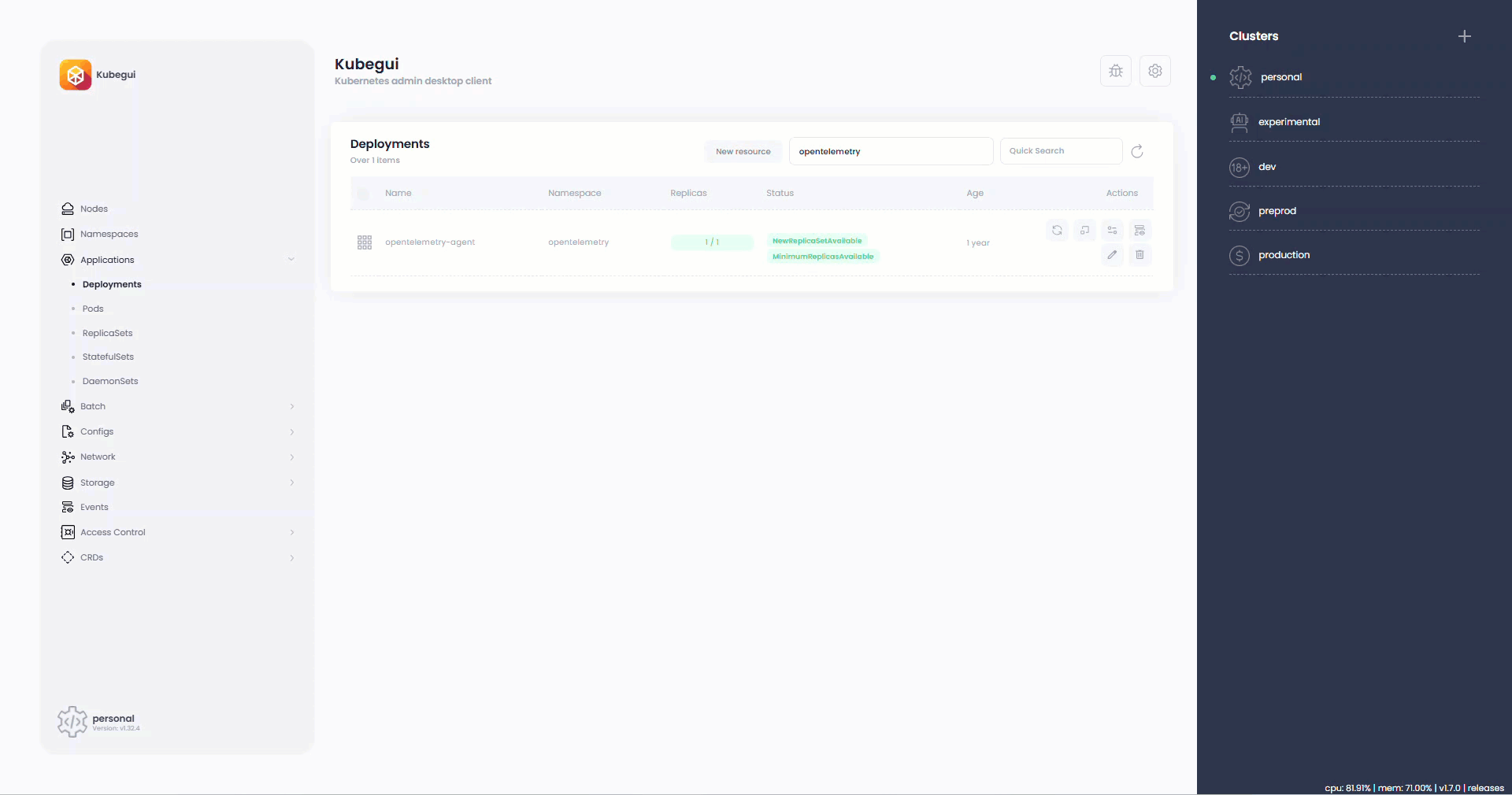 Deployments scaling and simple restart available from list view.